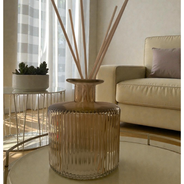 Difusor en envase de vidrio con 6 varillas naturales de rattan (podes elegirlas en color negro o natural).