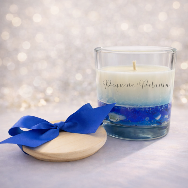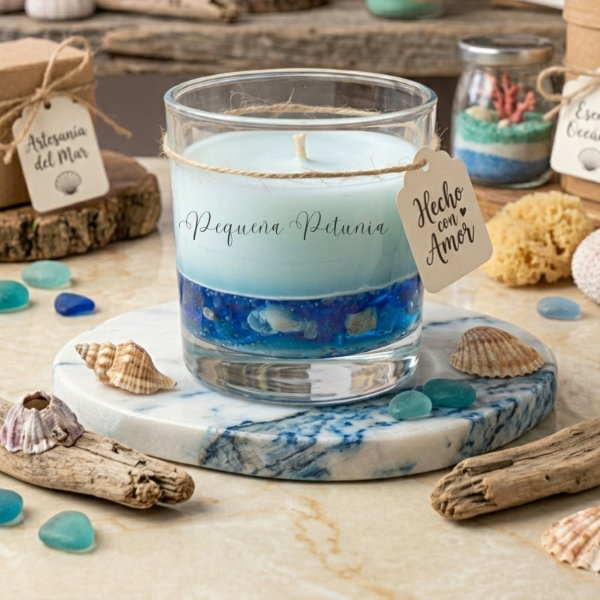 Base: parafina en gel (glitter y caracoles) + cera de soja en la superficie.